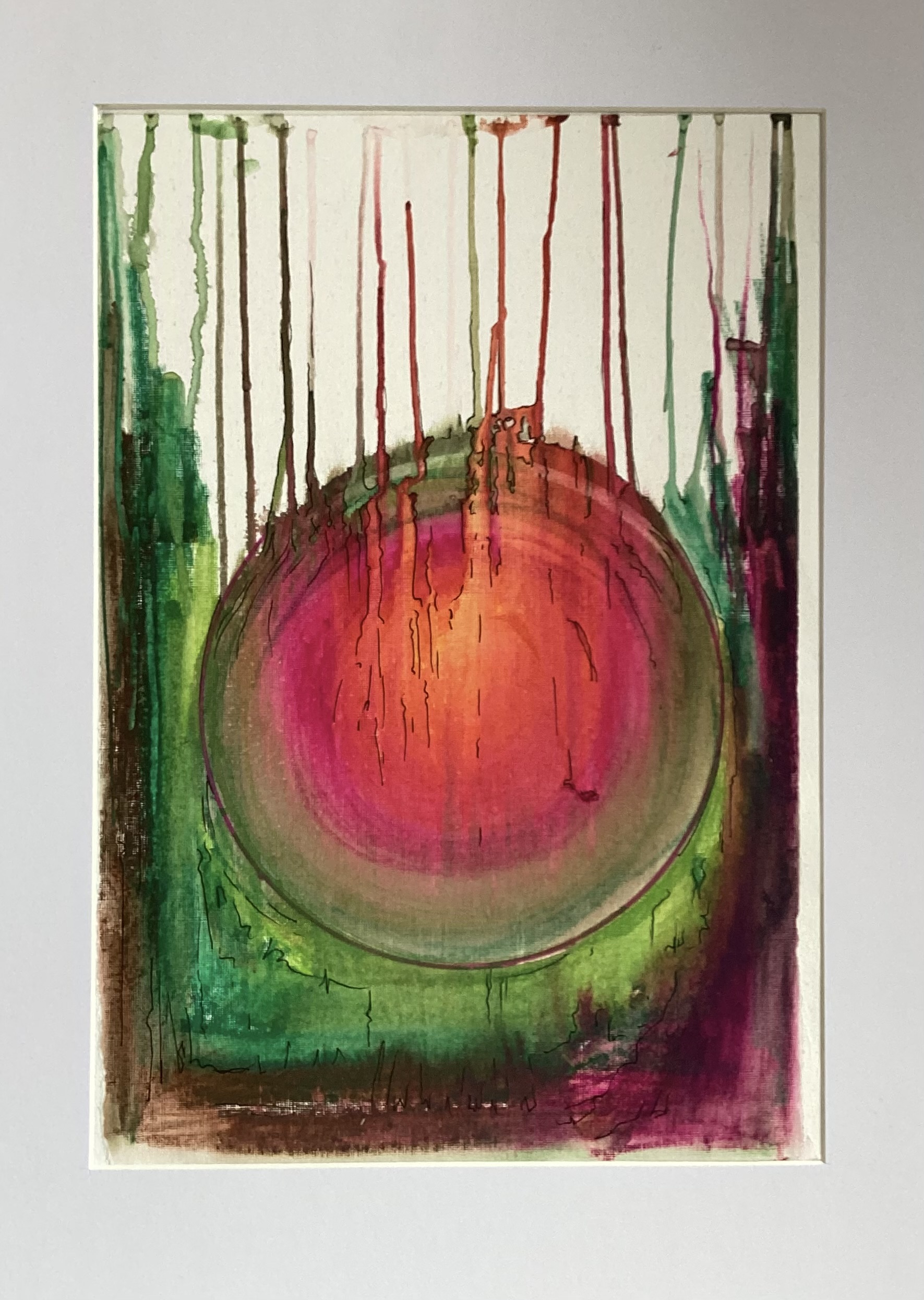 When I painted this I was experimenting with circles and vivid colours. It gives the impression of growth hence ‘Bulb’. It is a mixed media piece on canvas paper, presented in a white mount.