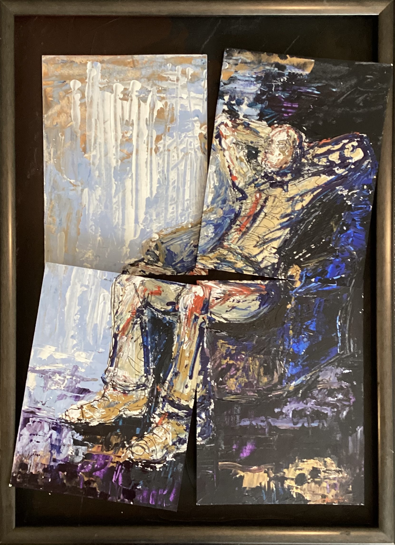 A seated figure painted on four canvases collaged within a frame.