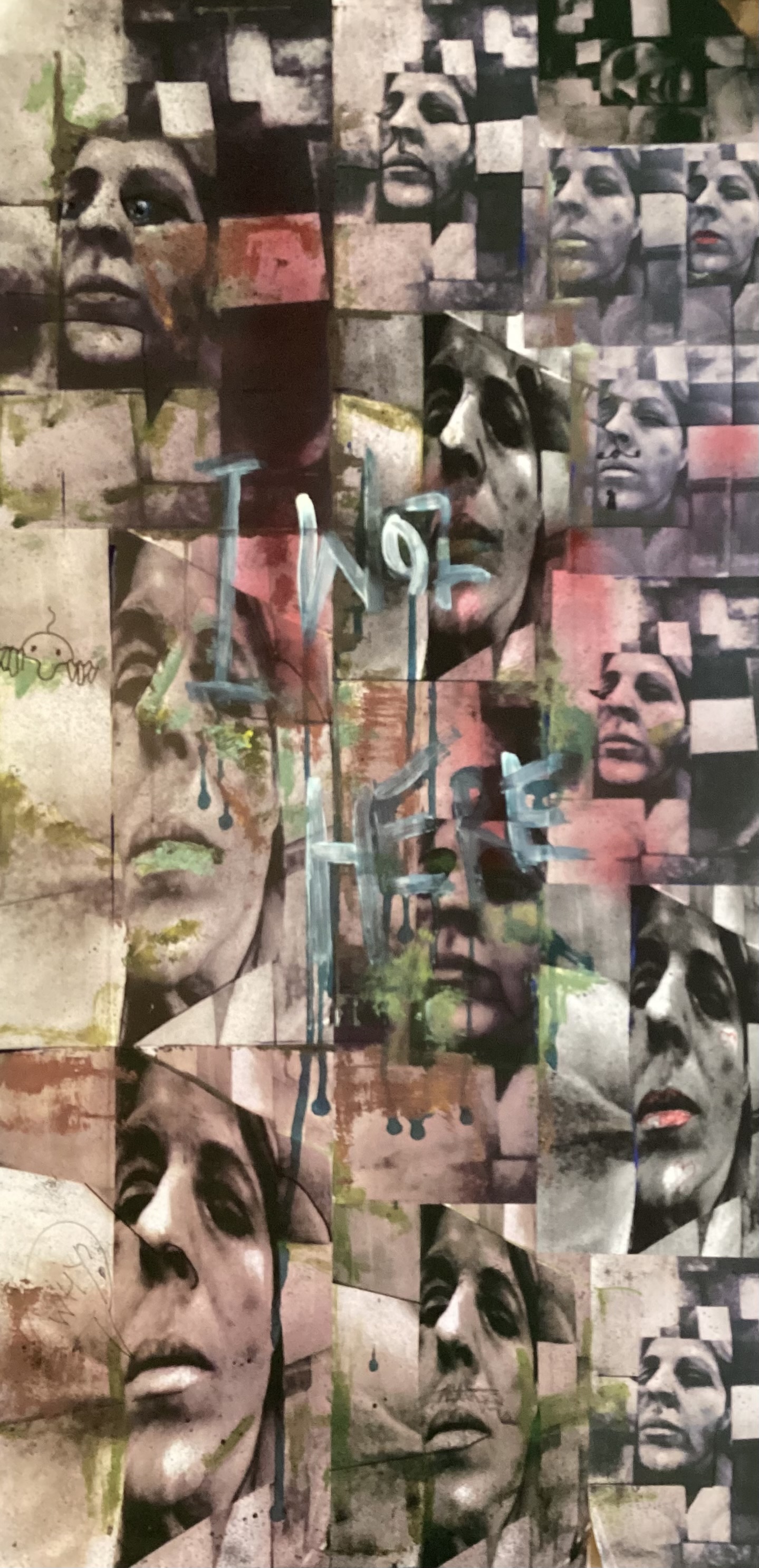 This was part of a collection of experimental , introspective works. Using photos, mixed media and collage to create a wall with graffiti in which I am part of the structure, am I strong? Just part of a larger structure or held down and boxed in?