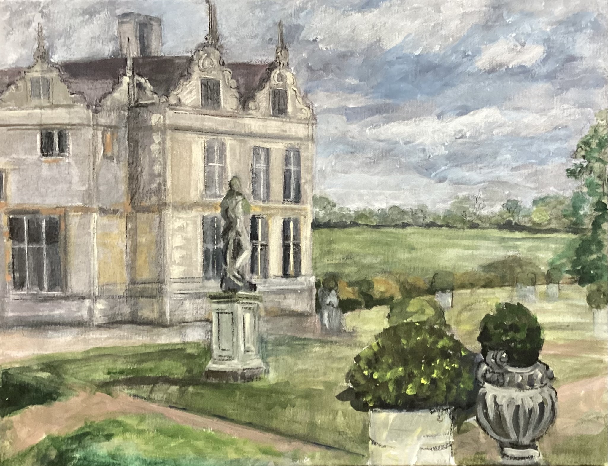 Plein air painting of Kirby hall in acrylic and charcoal on canvas.