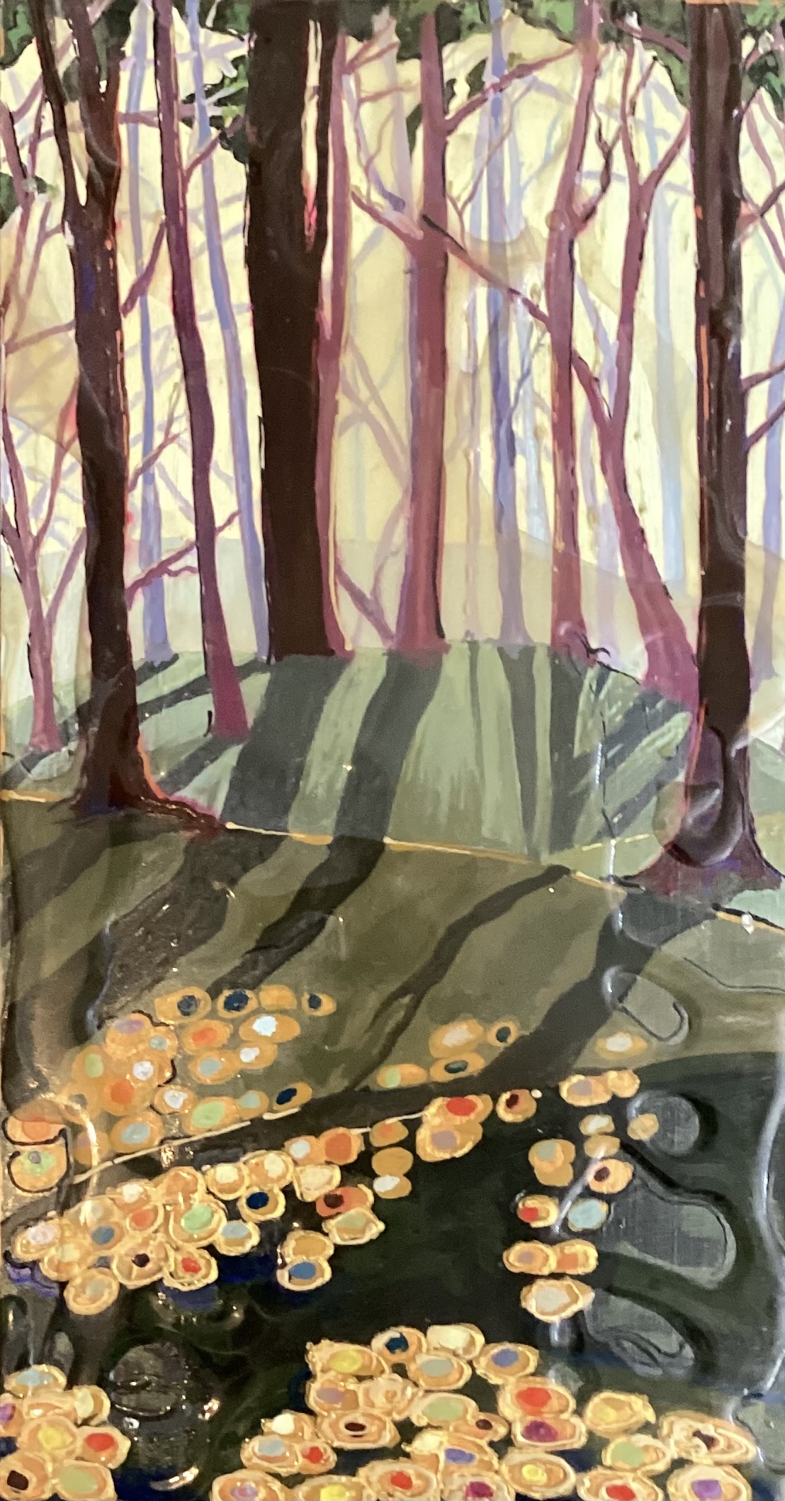 This is a painting in acrylic on a piece of wood . After painting I applied a clear resin which gives it an interesting texture and wet look.
