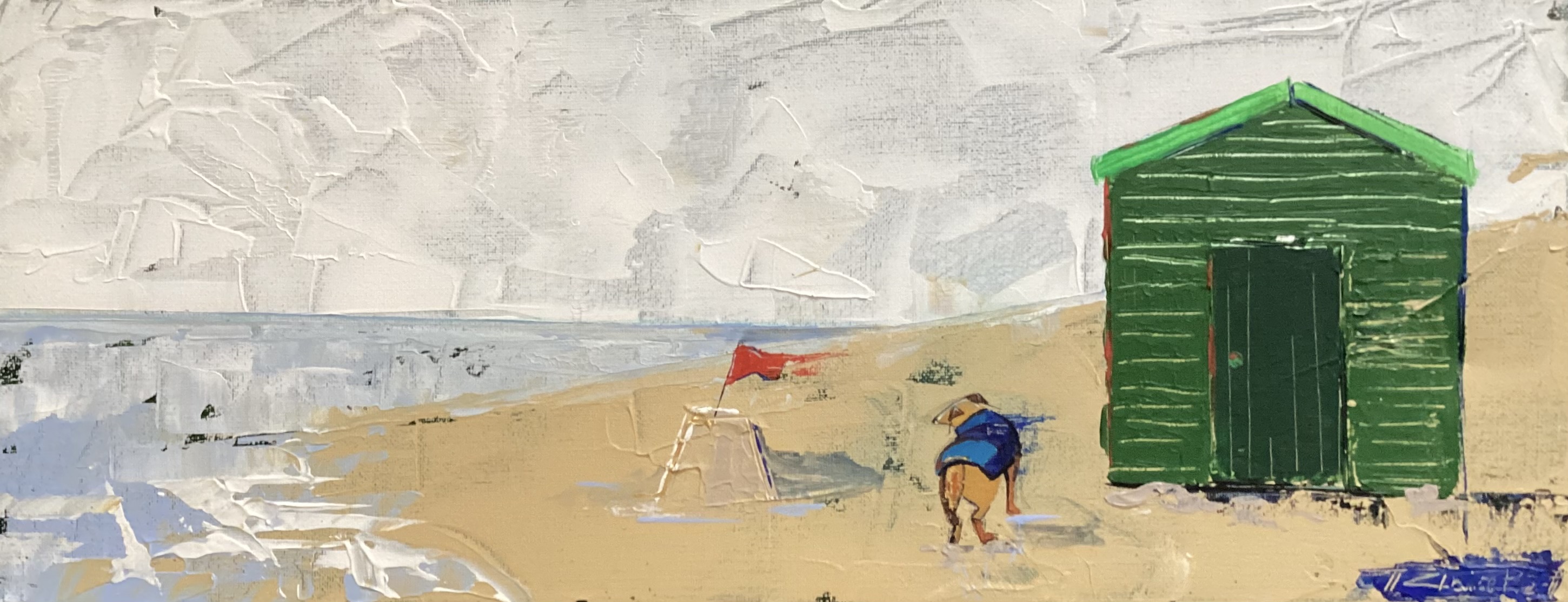 Another in a distinct angular style. A fun painting in textured acrylic of a dog on a beach guarding his castle (sand castle presumably although he could be guarding his beach hut?)