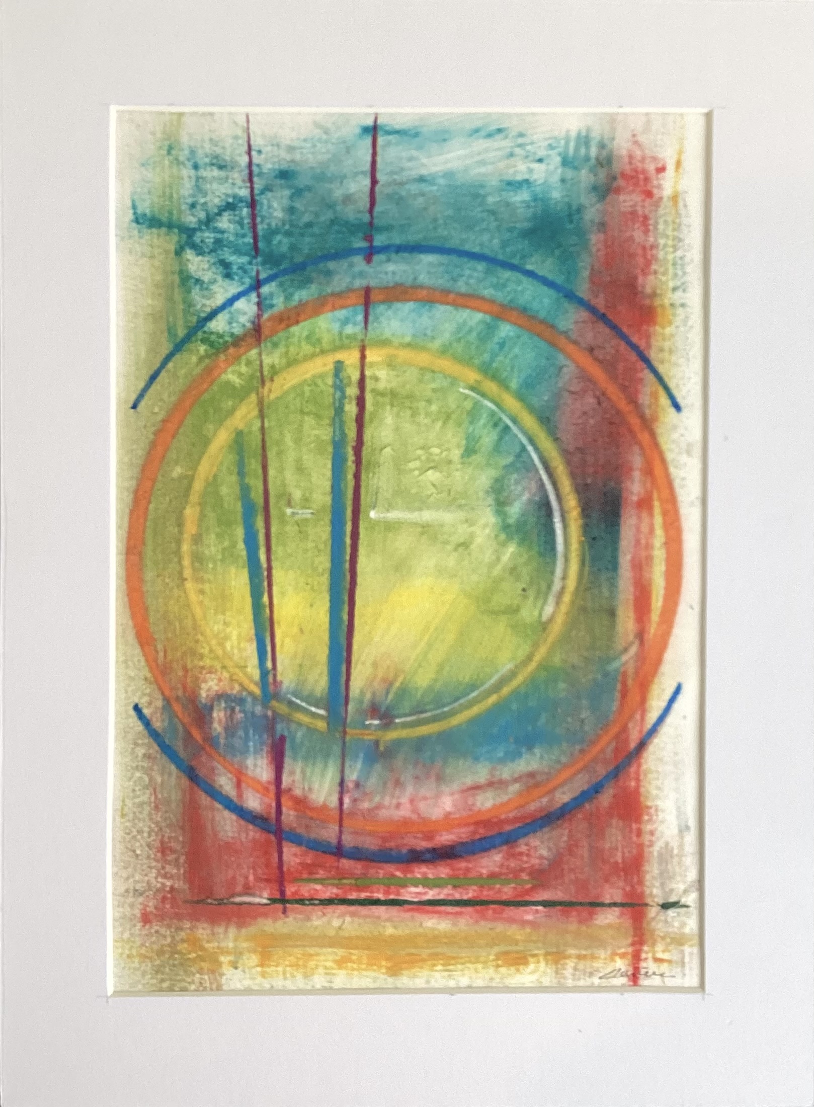 A mixed media piece of work using shapes lines and colour to create the impression of bulrushes.