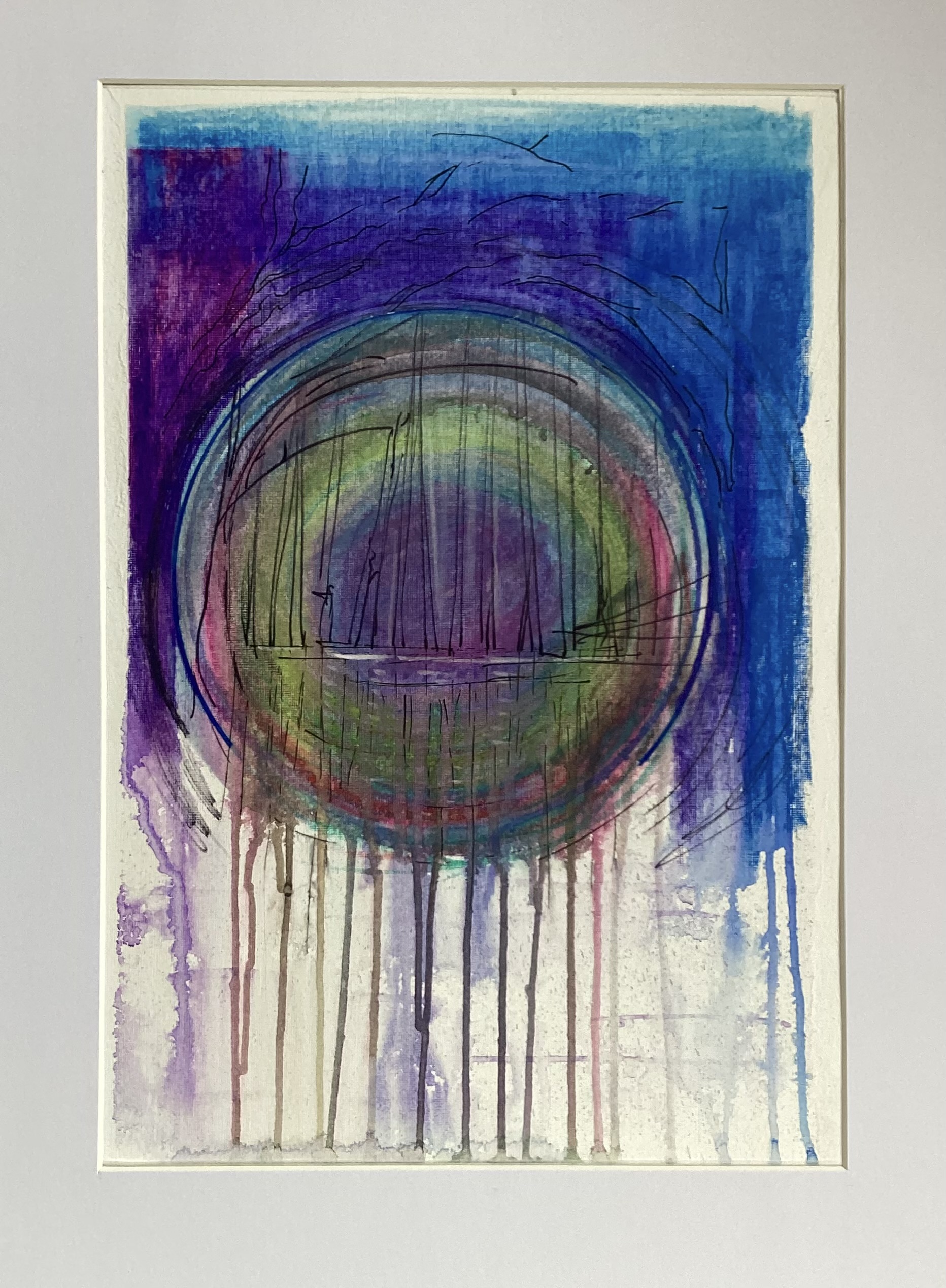 At this time I was experimenting with circles and colours. In this instance the piece had a watery feel to it and the suggestion of reflected images. This work is in mixed media on canvas paper and is presented in a white mount.