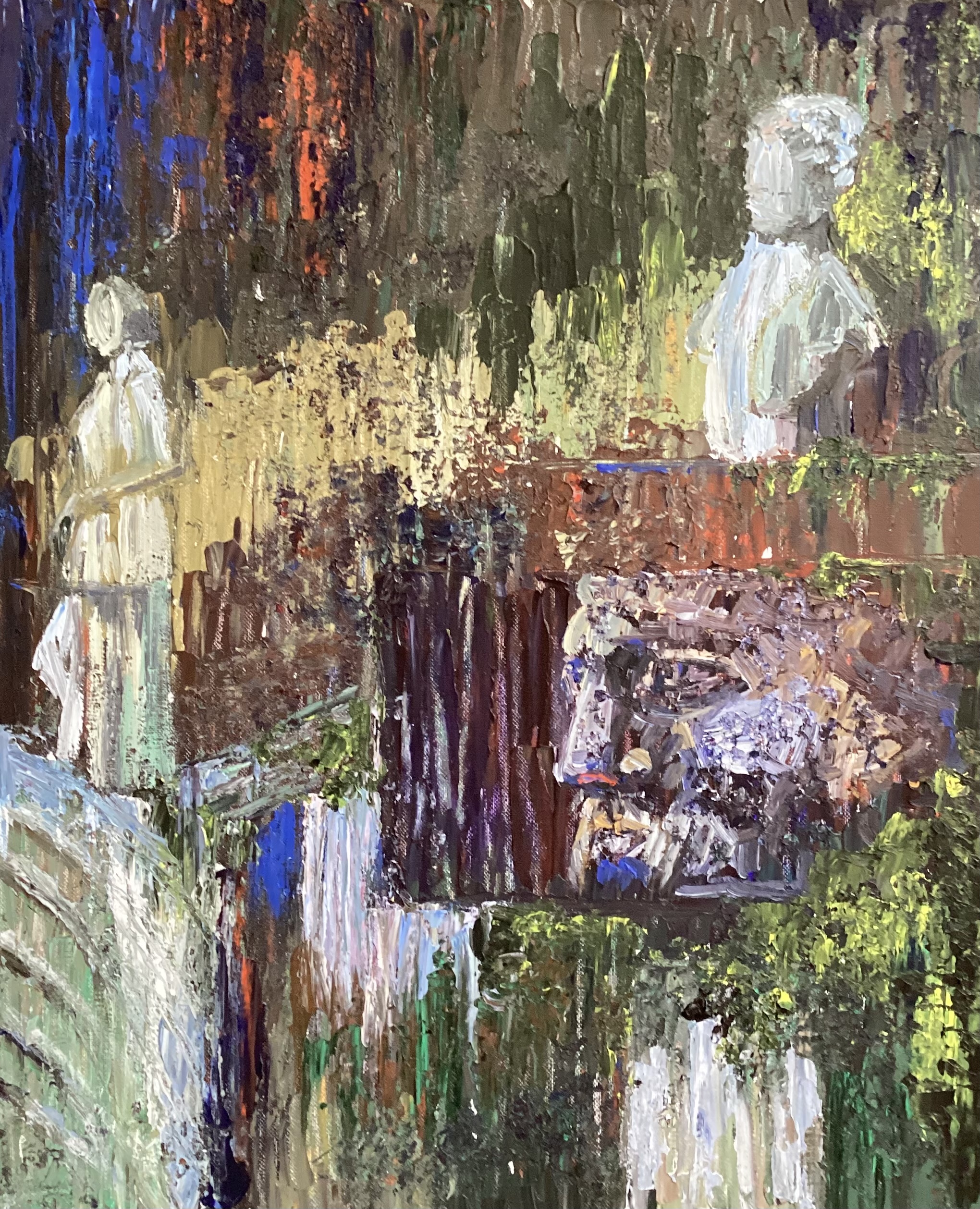 A painting in textured acrylic of a number of statues in an abstract setting.