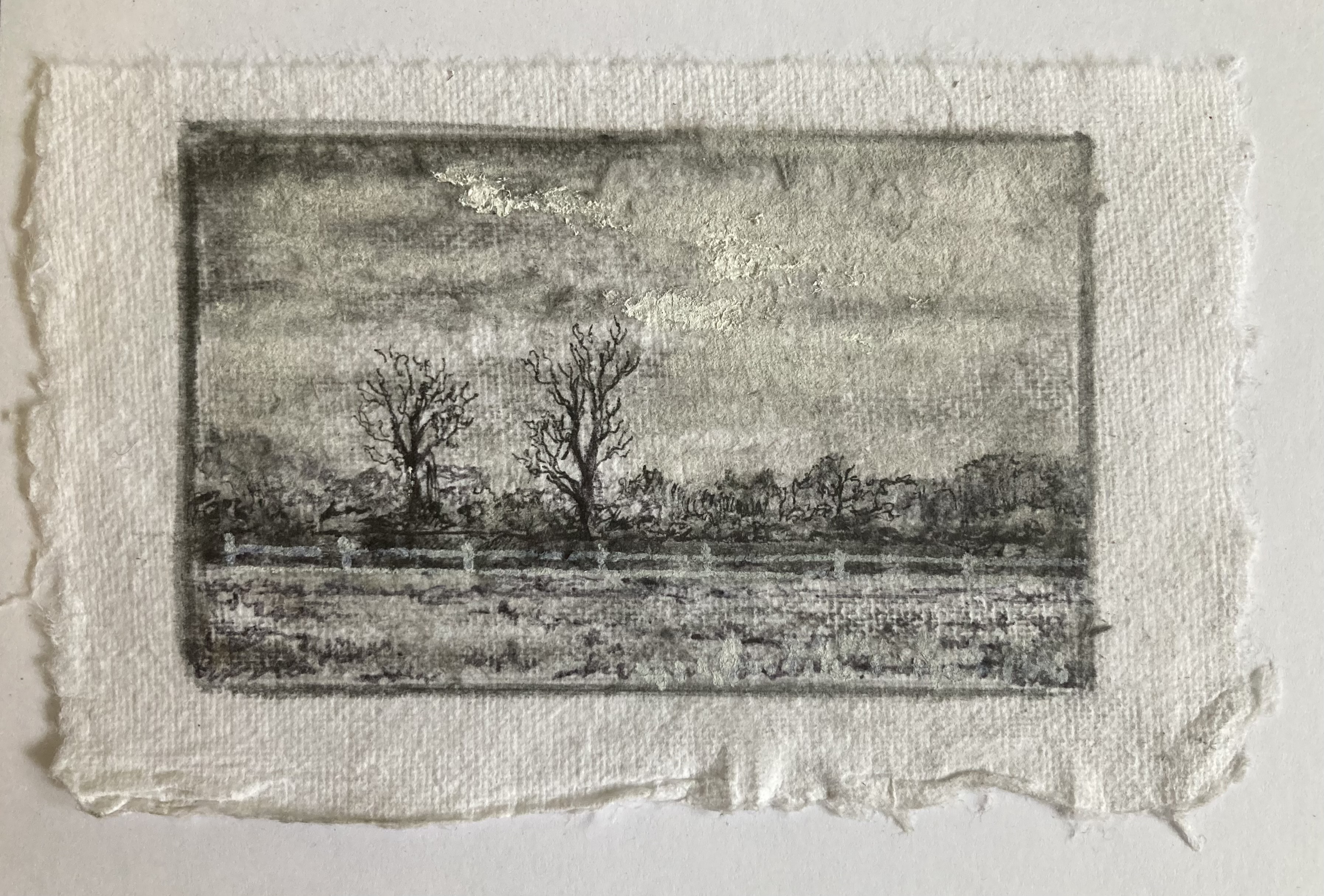 Landscape loooking across a field, drawn in pencil, graphite and ink pen on rag paper.