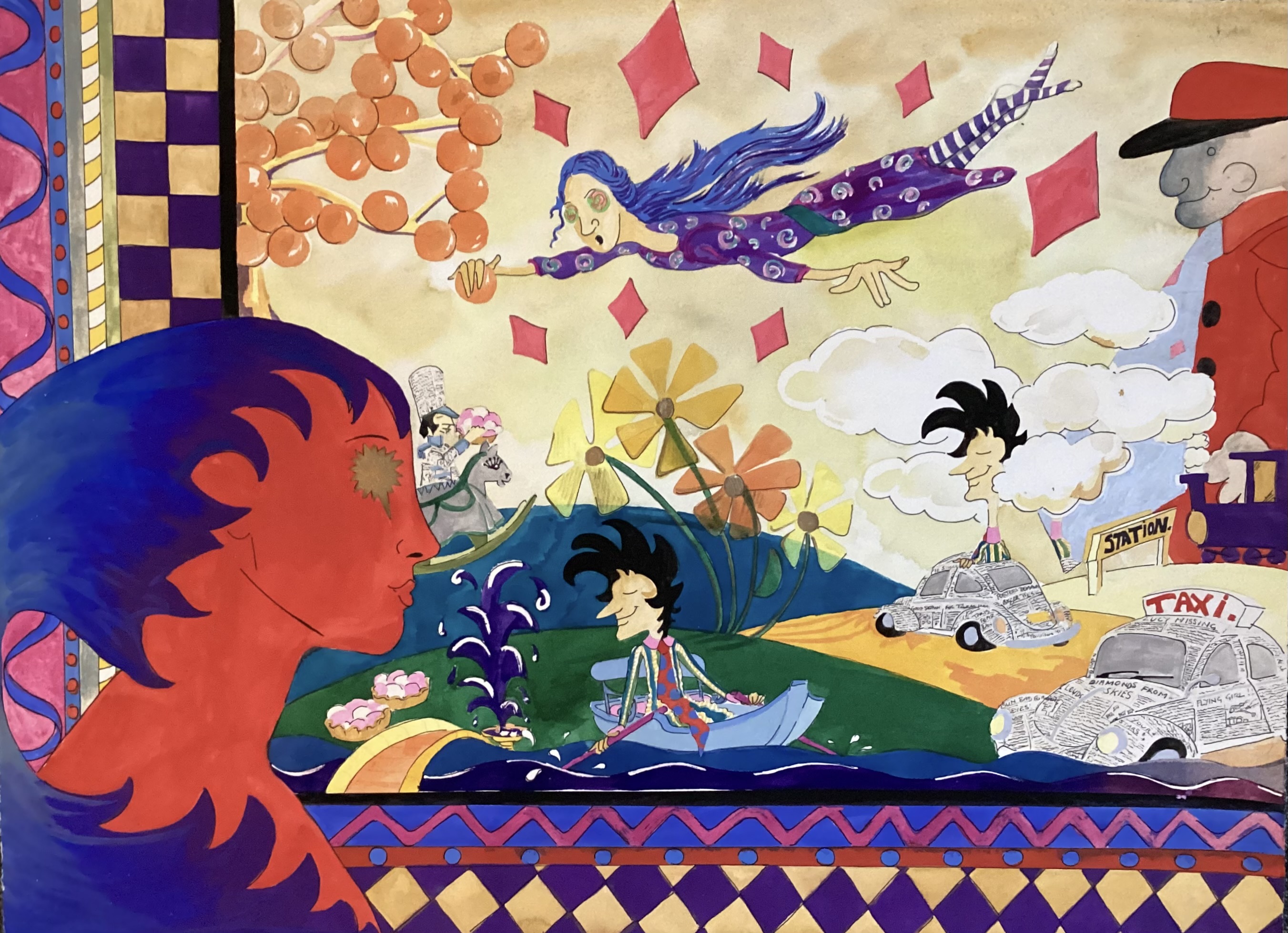 This is a mixed media painting on paper illustrating the lyrics of the iconic song. ‘Lucy in the sky with diamonds’