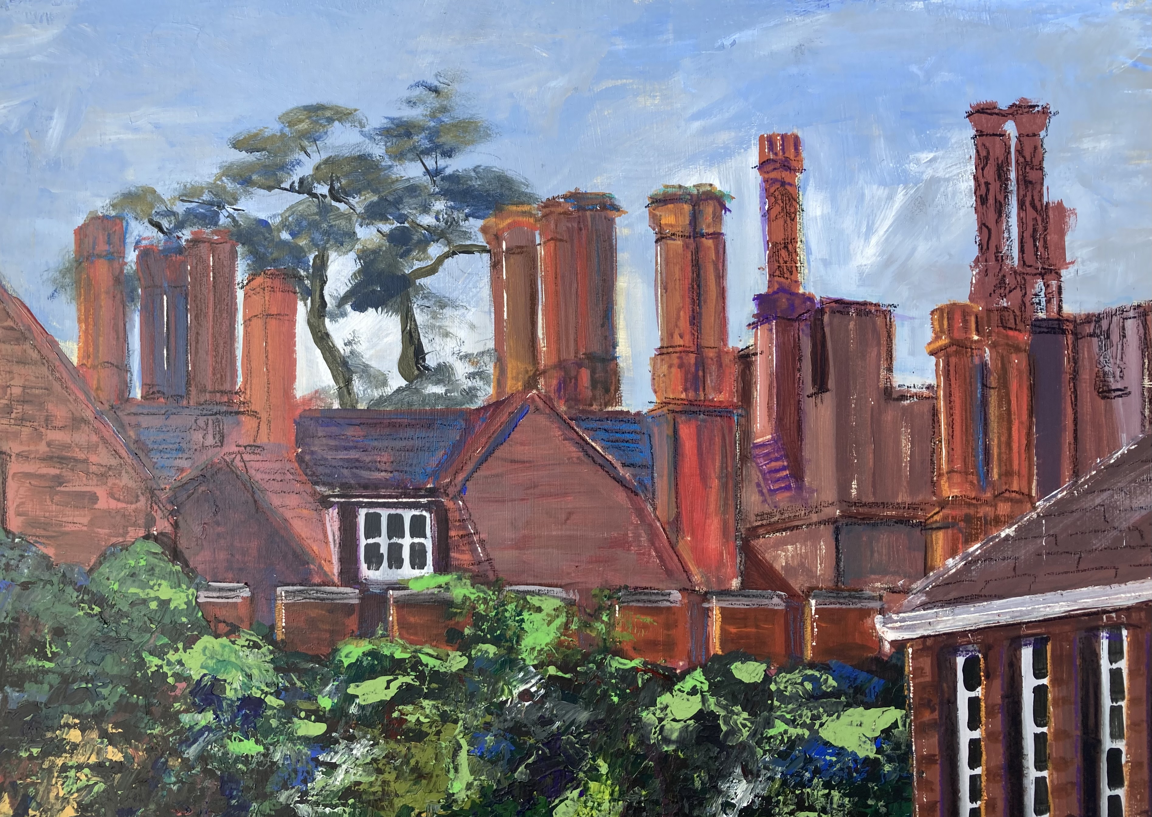 A mixed media painting on MDF, depicting some of the beautiful old chimneys at Hampton Court Palace.