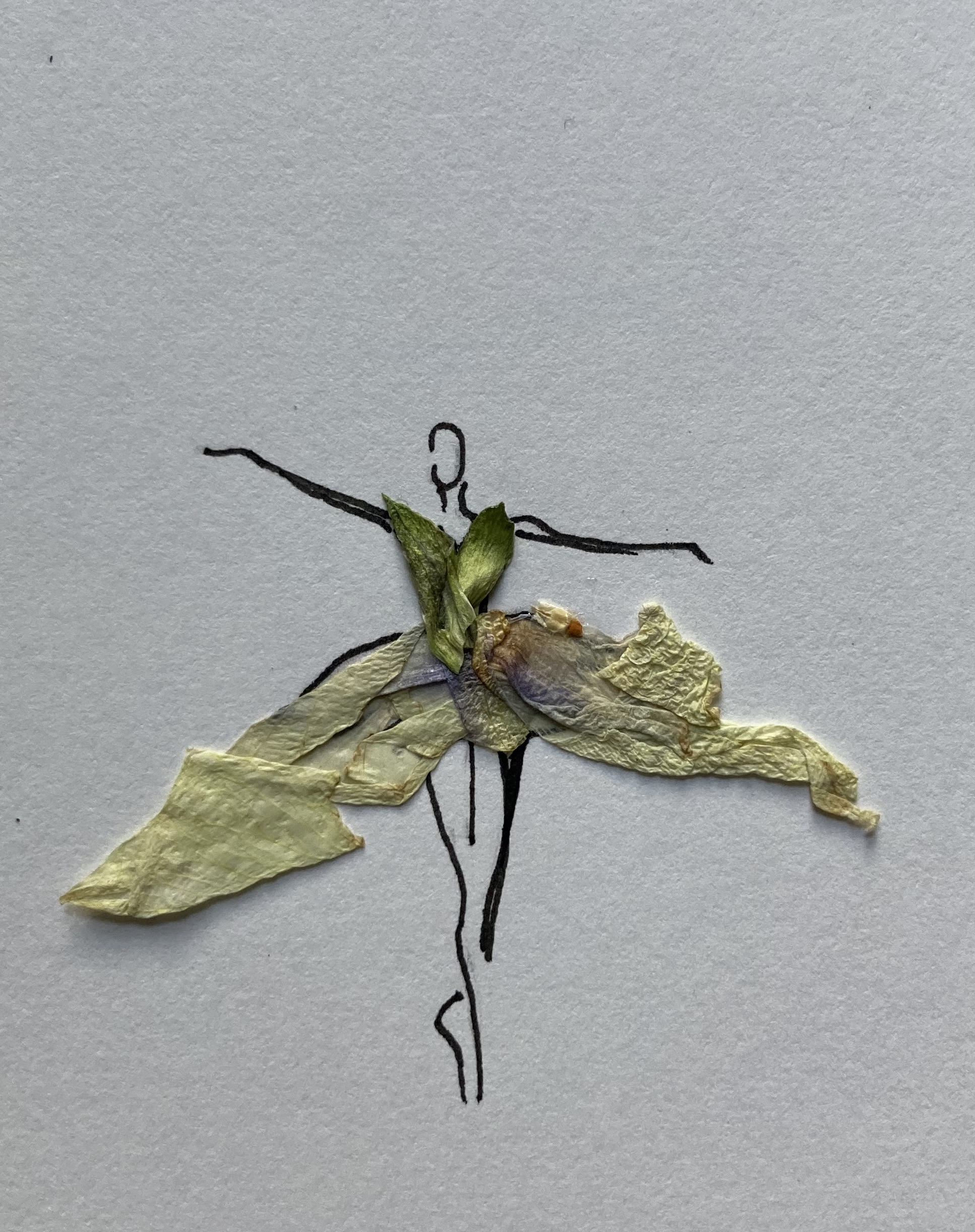 A mini ballet dancer, drawn with an ink pen with a dress of dried petals.