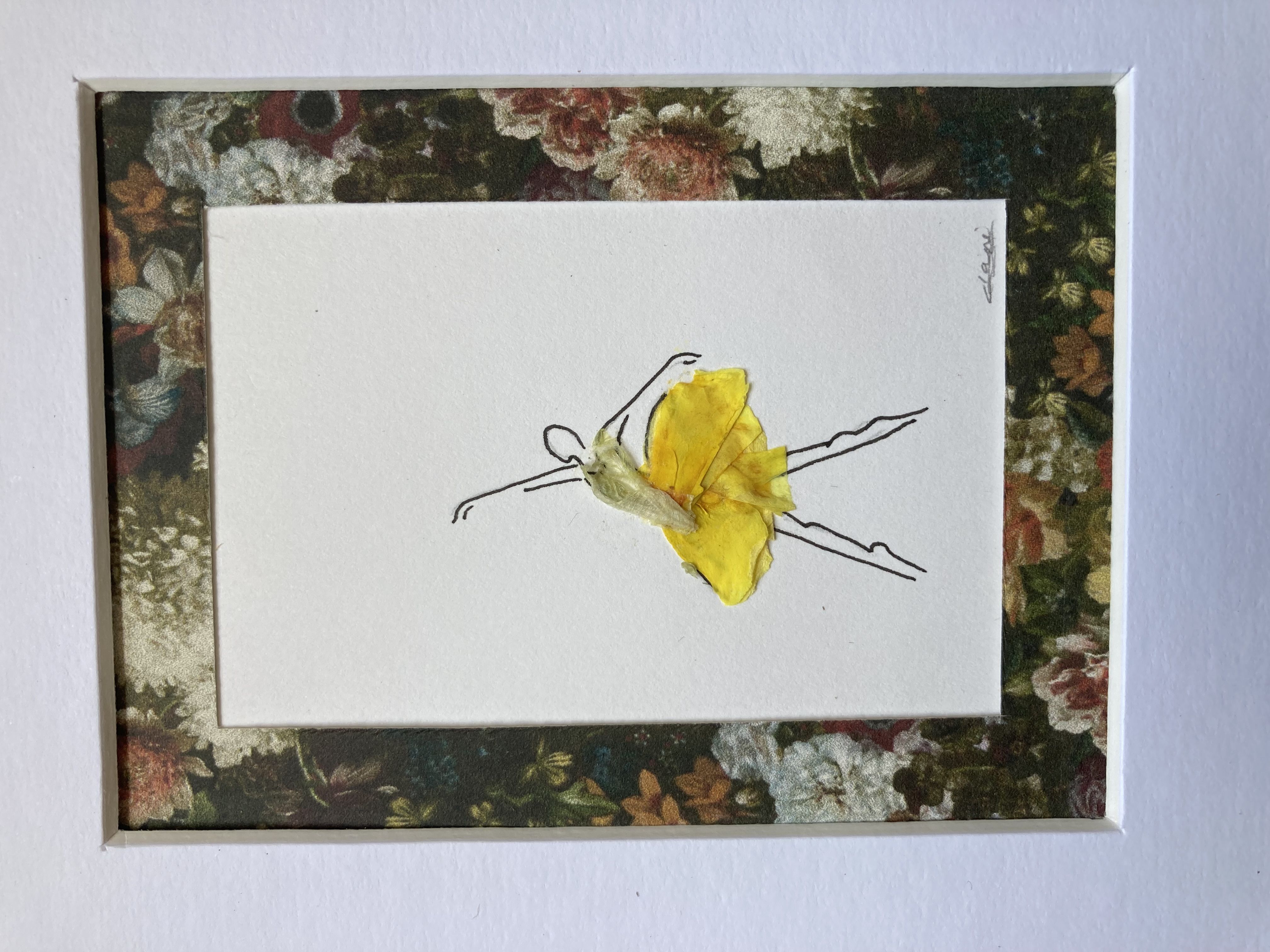 A miniature ballet dancer drawn in ink pen and clothed in dried petals
