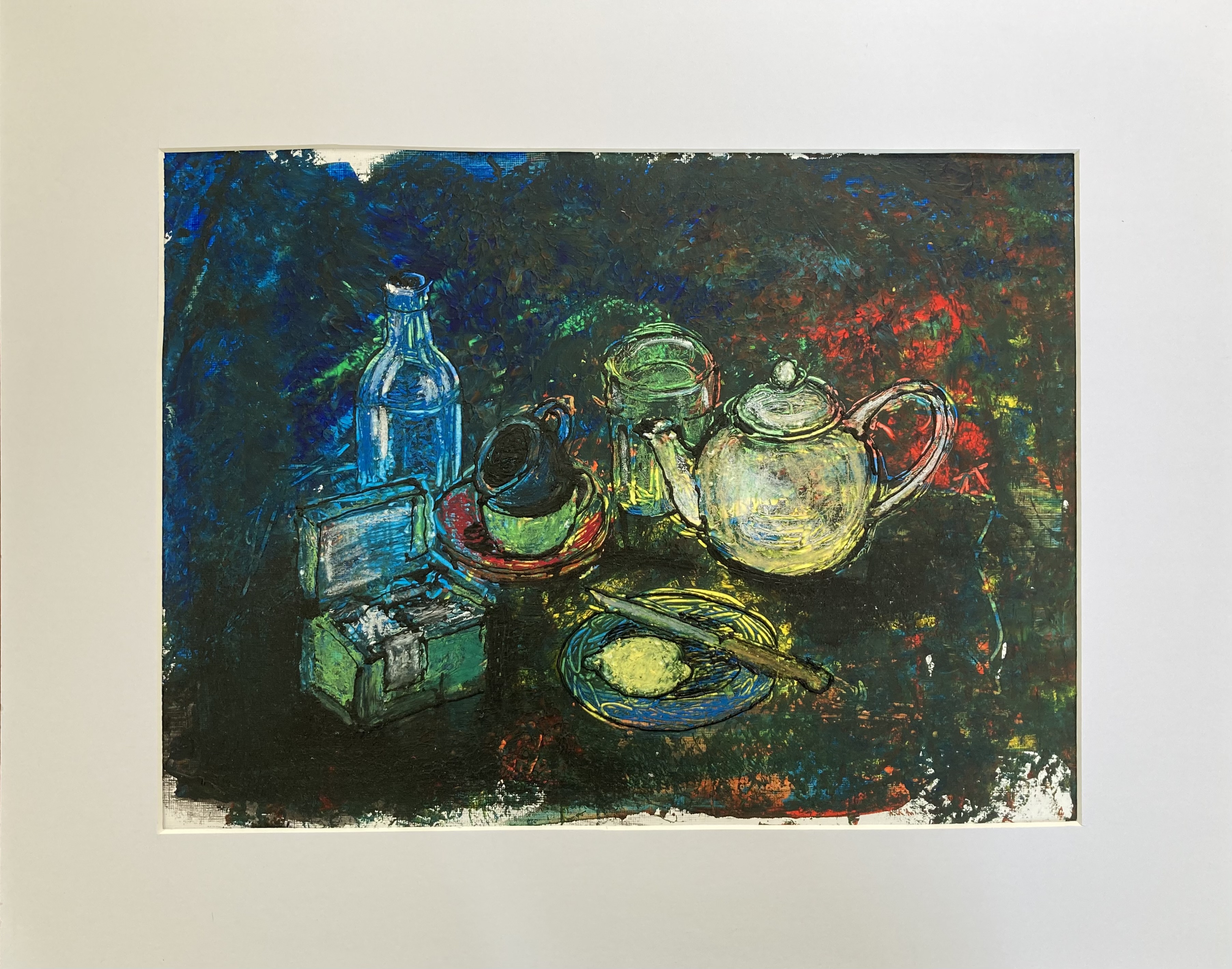 This still life is painted in textured acrylic and raised pen on canvas paper.