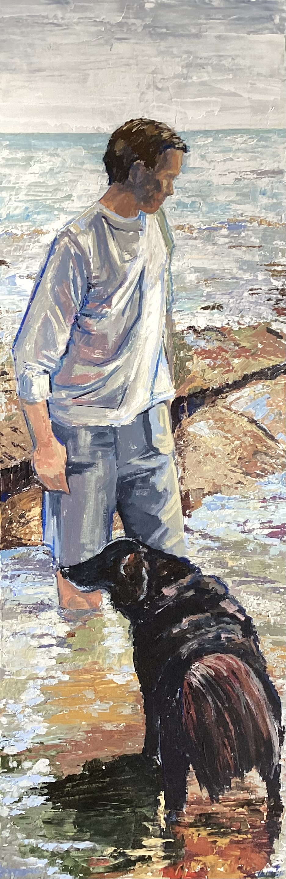 This is a very sentimental painting for me, capturing my husband and one of our dogs at the time ‘Dexter’  paddling on the Dorset coast.