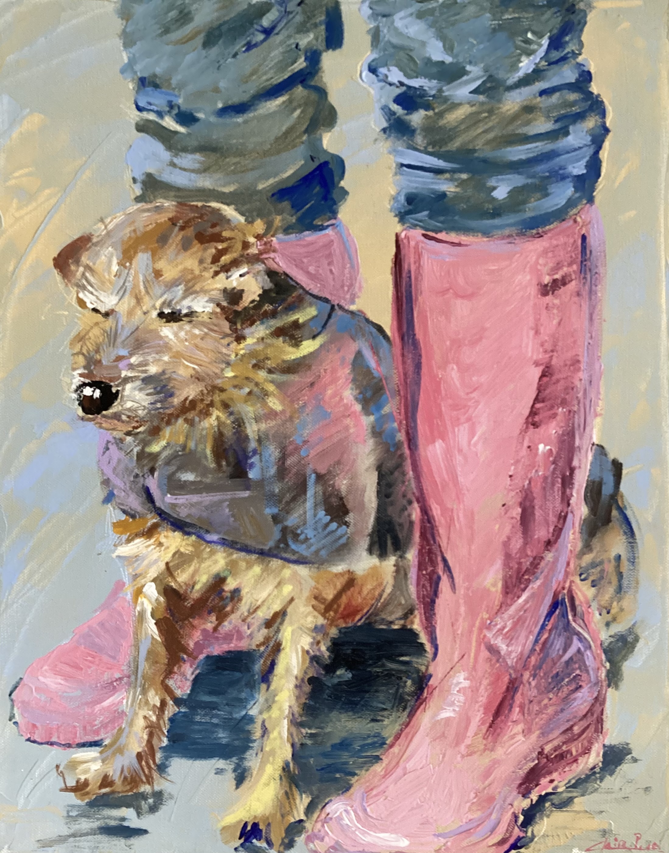 A painting in acrylic on canvas of my dog, called Biscuit but known by his nickname of Pickle, sitting by my feet when I was wearing pale pink wellingtons.