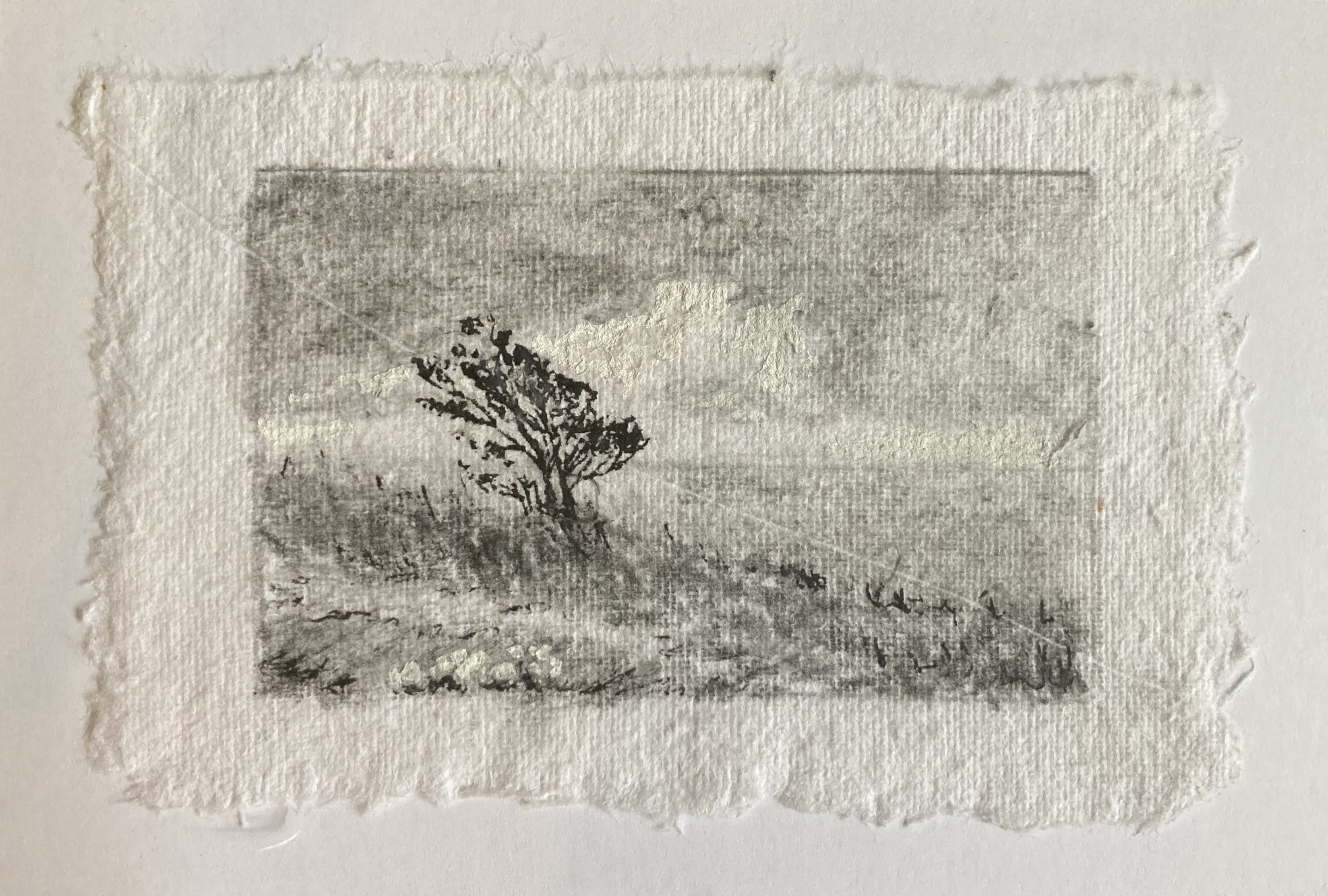A mini landscape drawn in graphite, pencil and ink pen on rag paper.