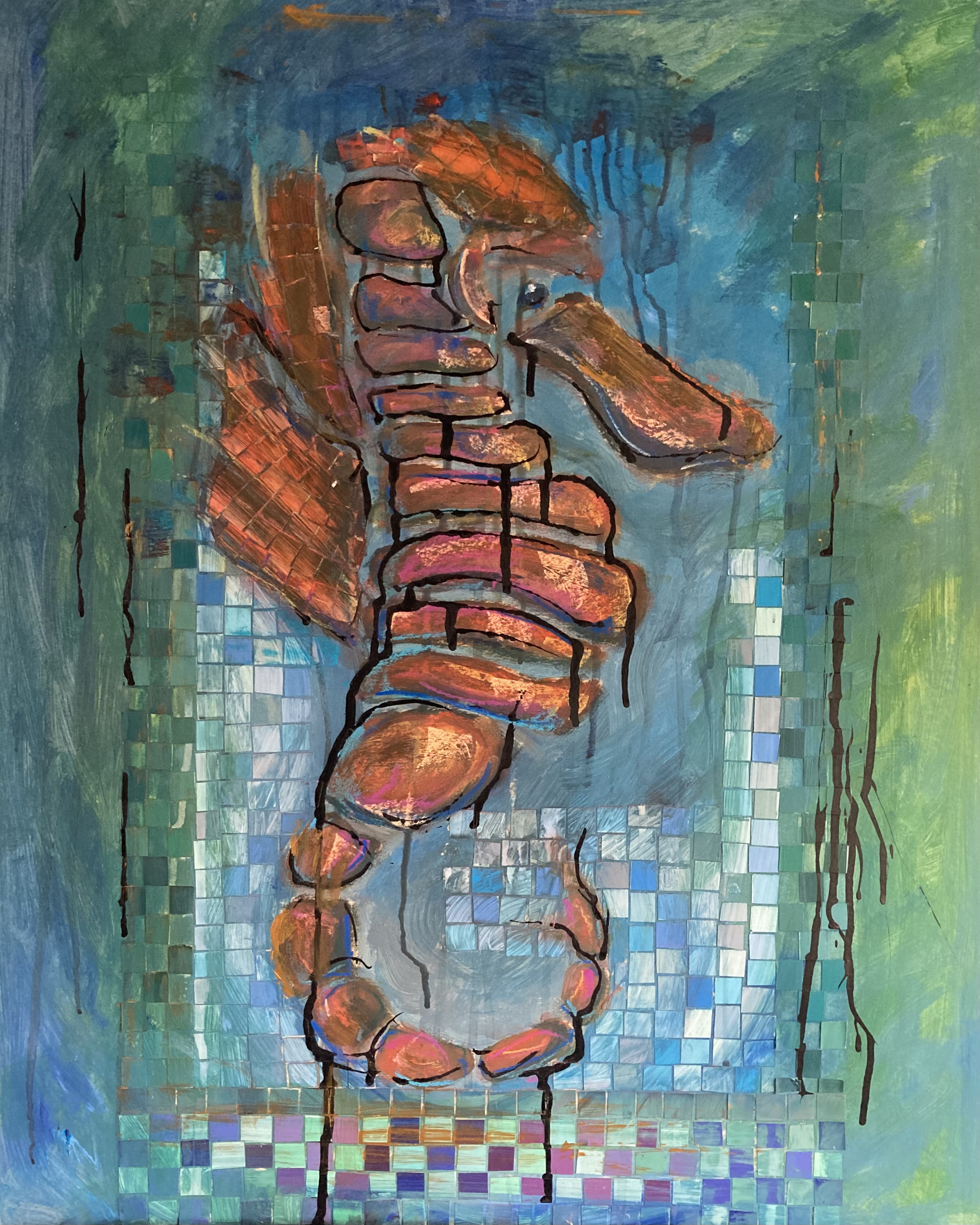 A mixed media collage on card depicting a mosaic styled seahorse.